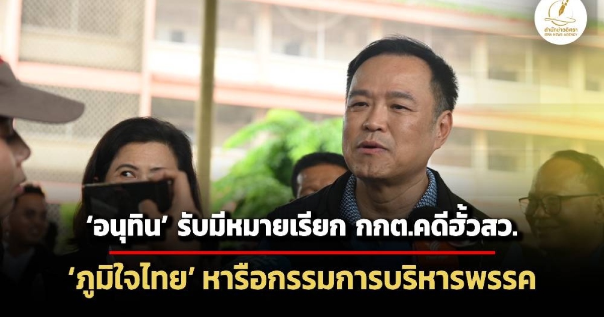 ‘อนุทิน’ รับแล้วมีหมายเรียกจาก กกต. คดีฮั้วสว.จริง ยืดอกเป็นบิ๊กของพรรคภูมิใจไทย มองไม่เกี่ยวสัญญาณปรับครม. ขณะที่พรรคนัดประชุมด่วนเย็นนี้ จับตาท่าที่คณะกรรมการบริหารพรรค