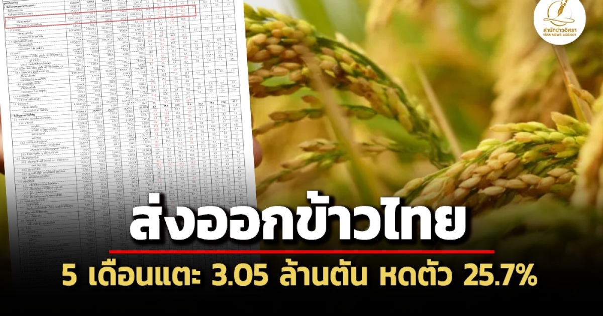 เดือน ก.พ.2568 ปริมาณการส่งออกข้าวลดลง 33.1% และมูลค่าส่งออกลดลง 34.3% ,เดือน มี.ค.2568 ปริมาณการส่งออกข้าวลดลง 15.6% และมูลค่าส่งออกลดลง 23.4% ,เดือน เม.ย.2568 ปริมาณการส่งออกข้าวลดลง 37.3% และมูลค่าส่งออกลดลง 44.1% และล่าสุดเดือน พ.ค.2568 ปริมาณการส่งออกข้าวลดลง 0.2% และมูลค่าส่งออกลดลง 9.9%