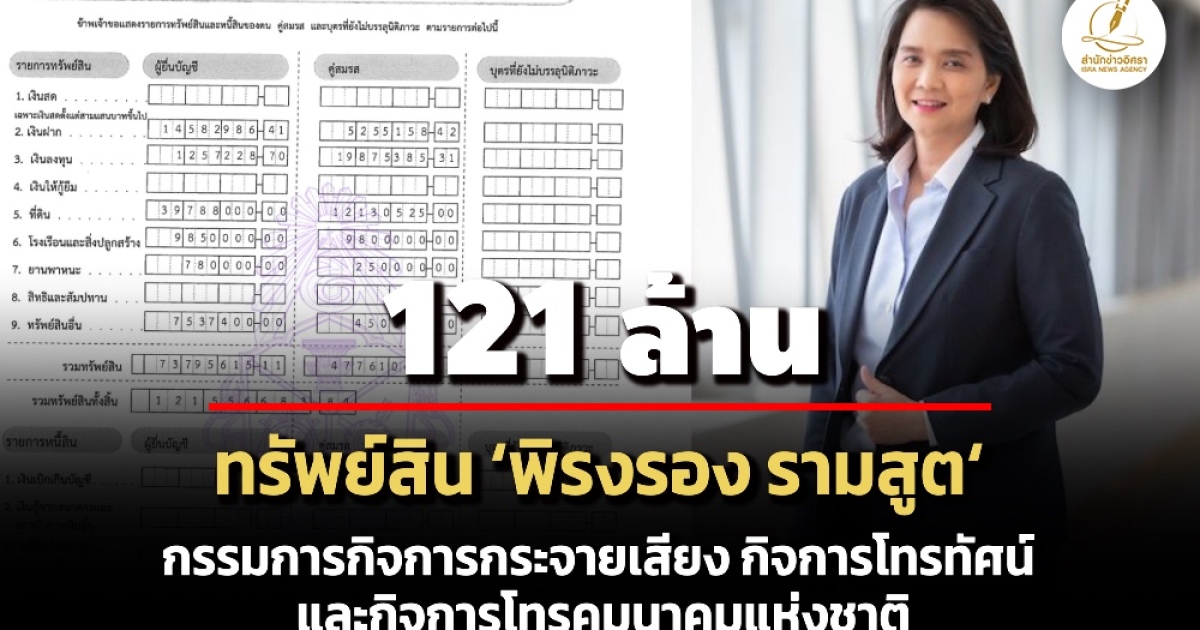 ป.ป.ช. เปิดทรัพย์สินผู้ดำรงตำแหน่งระดับสูง 'พิรงรอง รามสูต' กรรมการ กสทช. ทรัพย์สิน 121 ล. เงินฝาก 14 ล. รายได้ 4.5 ล./ปี