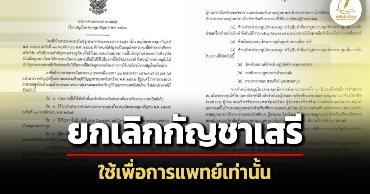 'สมศักดิ์' ลงนามประกาศ สธ. ยกเลิกกัญชาเสรี เน้นควบคุมเฉพาะส่วนช่อดอกกัญชา คนซื้อต้องมีใบรับรองแพทย์ ห้ามโฆษณาออนไลน์ ทุกช่องทางการค้า มีผลบังคับหลังประกาศในราชกิจจานุเบกษา