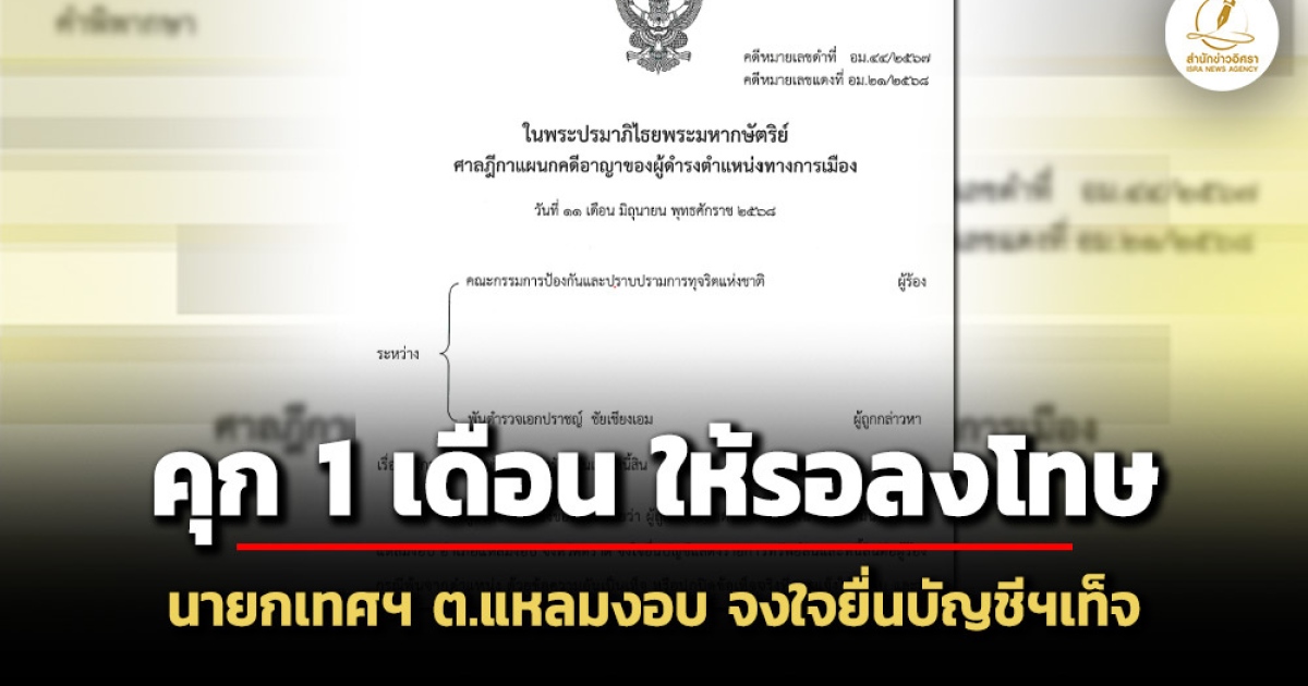 - ศาลฎีกาฯสั่งจำคุก 1 เดือน -รอลงโทษ รองนายกเทศฯ ต.โพธิ์ชัย ร้อยเอ็ด ยื่นบัญชีฯเท็จ