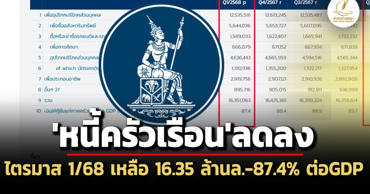สำนักข่าวอิศรา (www.isranews.org) รายงานว่า เมื่อวันที่ 30 มิ.ย. ธนาคารแห่งประเทศไทย (ธปท.) เผยแพร่ข้อมูลสถิติเงินให้กู้ยืมแก่ภาคครัวเรือน หรือหนี้สินครัวเรือน ณ สิ้นไตรมาส 1/2568 ปรากฎว่าหนี้สินครัวเรือน มีจำนวน 16,351,063 ล้านบาท คิดเป็นสัดส่วน 87.4% ต่อจีดีพี ลดลง 19,374 ล้านบาท หรือลดลง 0.12% เมื่อเทียบกับช่วงเดียวกันของปีก่อน (1/2567) ที่หนี้สินครัวเรือนมีจำนวน 16,370,438 ล้านบาท หรือคิดเป็น 90.7% ต่อจีดีพี