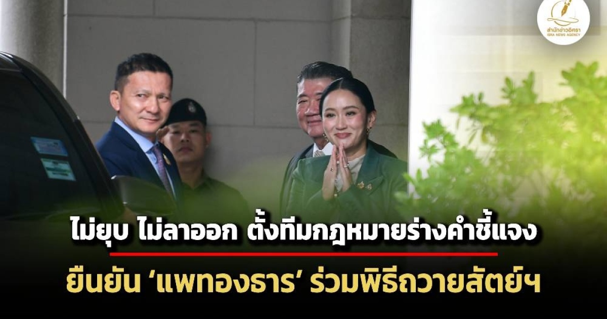 ‘แพทองธาร’ ไม่ยุบ ไม่ออกจากตำแหน่ง พร้อมตั้งทีมกฎหมายร่างคำชี้แจงต่อศาลรัฐธรรมนูญแล้ว ก่อนยืนยันสามารถร่วมพิธีถวายสัตย์ปฏิญาณได้เพราะศาลรัฐธรรมนูญยังไม่ได้ตัดสินว่าขาดคุณสมบัติ