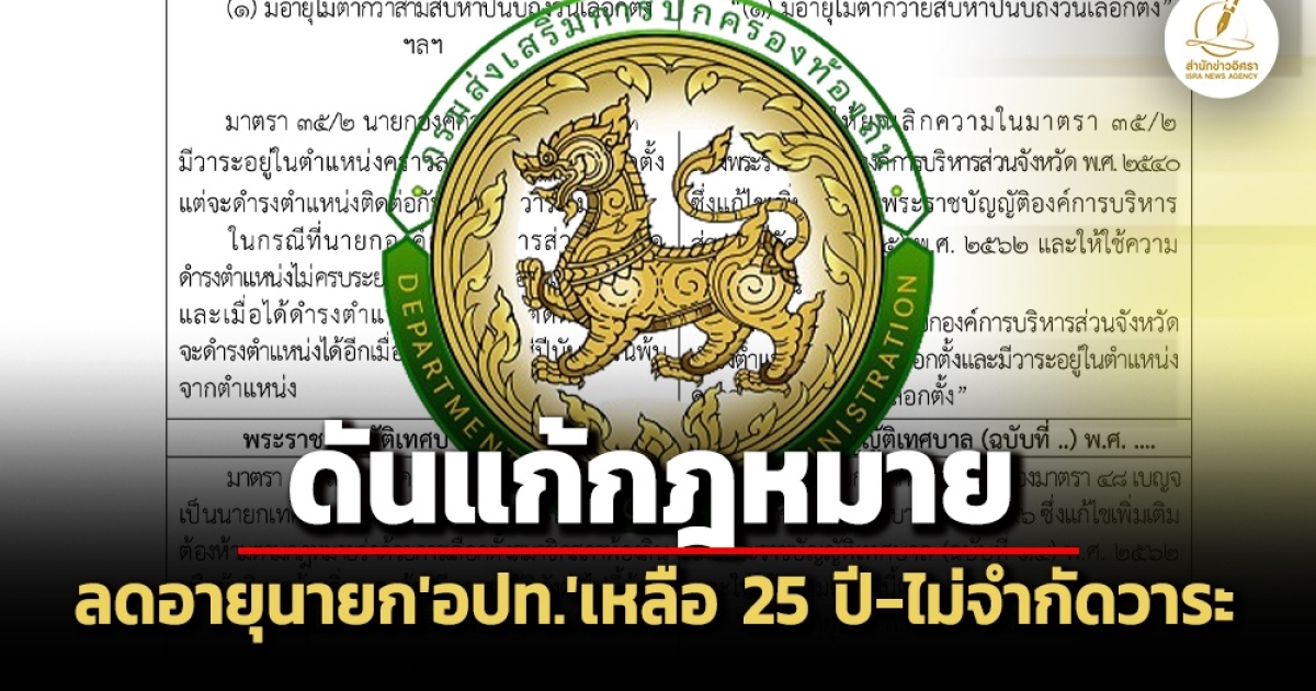 ‘กรมส่งเสริมการปกครองท้องถิ่น’ เปิดรับฟังความคิดเห็นร่าง พ.ร.บ.จัดตั้งฯ ‘อปท.’ 5 ฉบับ ลดอายุผู้มีสิทธิรับเลือกตั้งเป็น 'นายกฯ ‘ท้องถิ่น’ เหลือไม่ต่ำกว่า 25 ปี จากเดิม 35 ปี พร้อมยกเลิกข้อจำกัดวาระการดำรงตำแหน่ง หวังเปิดทาง ‘คนรุ่นใหม่’ เข้ามาบริหารท้องถิ่น-วางแผนพัฒนาฯได้ต่อเนื่อง