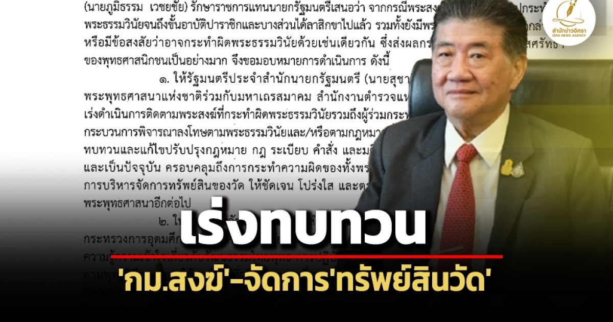 สำนักข่าวอิศรา (www.isranews.org) รายงานว่า ในการประชุมคณะรัฐมนตรี (ครม.) เมื่อวันที่ 15 ก.ค.ที่ผ่านมา นายภูมิธรรม เวชยชัย รองนายกรัฐมนตรี และรมว.มหาดไทย ในฐานะรักษาราชการแทนนายกรัฐมนตรี เสนอว่า จากกรณีพระสงฆ์ชั้นผู้ใหญ่หลายรูปกระทำผิดพระธรรมวินัยจนถึงขั้นอาบัติปาราชิก และบางส่วนได้ลาสิกขาไปแล้ว รวมทั้งยังมีพระสงฆ์อีกหลายรูปที่ถูกกล่าวหาหรือมีข้อสงสัยว่าอาจกระทำผิดพระธรรมวินัยด้วยเช่นเดียวกัน ซึ่งส่งผลกระทบต่อความเลื่อมใสศรัทธาของพุทธศาสนิกชนเป็นอย่างมาก จึงขอมอบหมายการดำเนินการ ดังนี้
