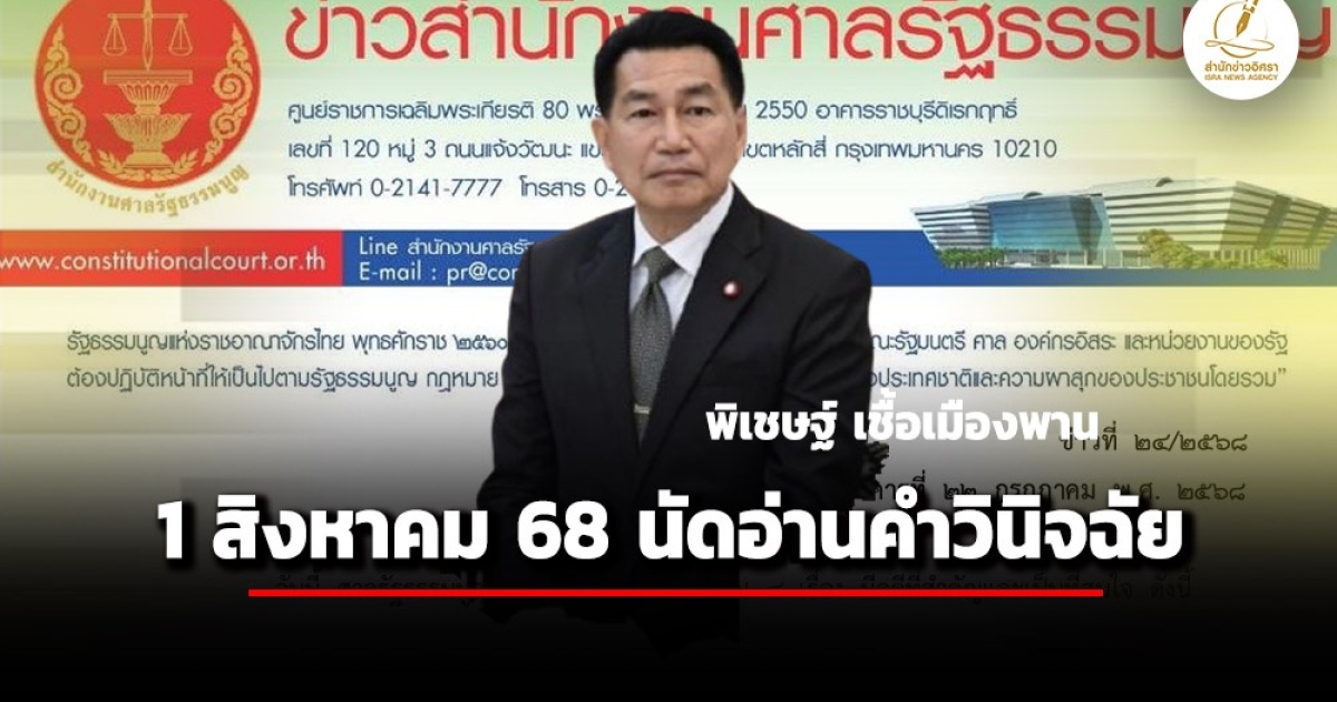 ศาลรัฐธรรมนูญ สั่ง จัดส่งสำเนาเอกสารหลักฐาน คำร้อง พิเชษฐ์ เชื้อเมืองพาน รองประธานสภาฯ คนที่หนึ่ง แปรงบปี 69 ขัดรัฐธรรมนูญ มาตรา 144 วรรคสอง ภายใน 23 ก.ค. นัดไต่สวนพยานบุคคล 24 ก.ค.68