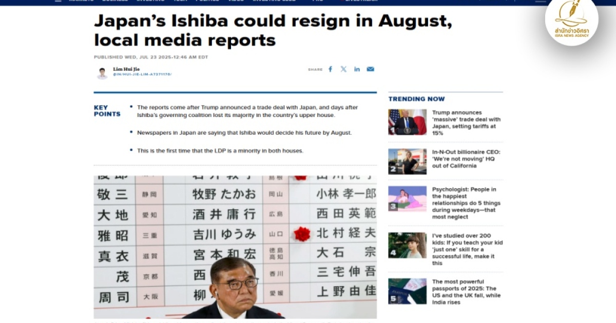 สำนักข่าวอิศรา (www.isranews.org) รายงานข่าวอ้างอิงสำนักข่าว CNBC ของสหรัฐอเมริกาว่า สื่อท้องถิ่นญี่ปุ่นรายงานว่า นายกรัฐมนตรีชิเงรุ อิชิบะของญี่ปุ่น ซึ่งกำลังเผชิญปัญหาทางการเมือง อาจจะลาออกภายในเดือนสิงหาคม