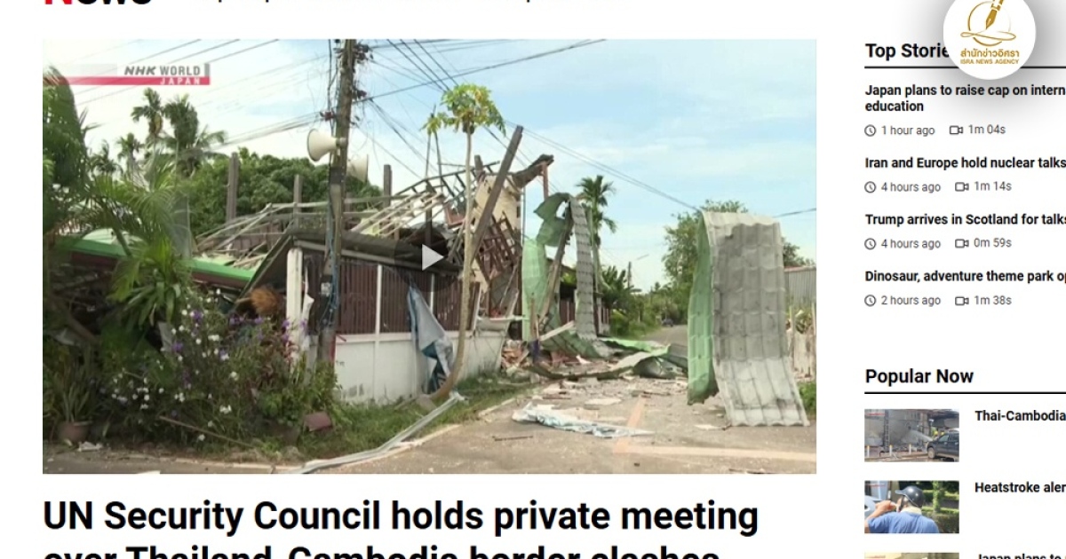 สำนักข่าวอิศรา (www.isranews.org) รายงานข่าวความเคลื่อนไหวจากต่างประเทศ เกี่ยวกับสถานการณ์สู้รบชายแดนไทยว่าคณะมนตรีความมั่นคงแห่งสหประชาชาติได้ประชุมลับท่ามกลางการปะทะกันทางชายแดนระหว่างไทยและกัมพูชา ในขณะที่กัมพูชาเรียกร้องให้มีการหยุดยิงทันที แต่ไทยกําลังเรียกร้องให้กลับมาเจรจาผ่านกลไกทวิภาคีอีกครั้ง