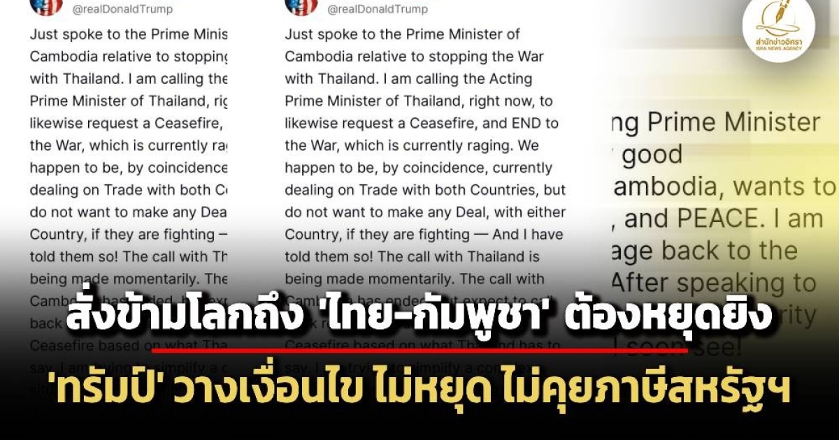 สำนักข่าวอิศรา (www.isranews.org) รายงานว่า วันที่ 27 กรกฎาคม 2568 นายโดนัลด์ ทรัมป์ ประธานาธิบดีแห่งสหรัฐอเมริกา โพสต์ข้อความผ่านแอปพลิเคชั่น TRUTH 3 สเตตัส สเตตัสแรกเมื่อเวลา 22.28 น.ของวันที่ 26 ก.ค. 2568 ตามเวลาในประเทศไทยความว่า ได้คุยกับนายกรัฐมนตรีกัมพูชา (ฮุนมาเนต) ถึงการยุติสงครามกับไทย ขอเรียกร้องให้รักษารการนายกรัฐมนตรีของไทย (ภูมิธรรม เวชยชัย) หยุดยิงและยุติสงครามที่กำลังดำเนินอยู่ตอนนี้ บังเอิญว่าเรากำลังเจรจาการค้ากับทั้งสองประเทศอยู่ ซึ่งสหรัฐฯจะไม่ทำข้อตกลงใดๆ กับทั้งสองประเทศ หากพวกเขายังสู้รบกันอยู่ ซึ่งได้แจ้งทั้งสองประเทศไปแล้ว โดยได้คุยกับกัมพูชาแล้ว และกำลังจะคุยกับทางการไทย อาจจะต้องโทรกลับไปกัมพูชาเกี่ยวกับการหยุดยิงตามที่ไทยบอกไว้
