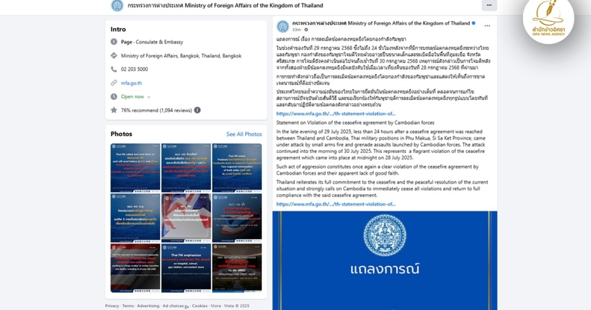 สำนักข่าวอิศรา (www.isranews.org) รายงานสถานการณ์ที่เกี่ยวข้องกับความขัดแย้งพรมแดนไทย-กัมพูชาหลังการทำข้อตกลงหยุดยิงเมื่อวันที่ 28 กรกฎาคม โดยเฟซบุ๊กกระทรวงต่างประเทศได้มีการแถลงข่าวถึงกรณีที่กัมพูชาละเมิดข้อตกลงหยุดยิงระบุว่าในช่วงค่ำของวันที่ 29 กรกฎาคม 2568 ซึ่งไม่ถึง 24 ชั่วโมงหลังจากที่มีการบรรลุข้อตกลงหยุดยิงระหว่างไทยและกัมพูชา