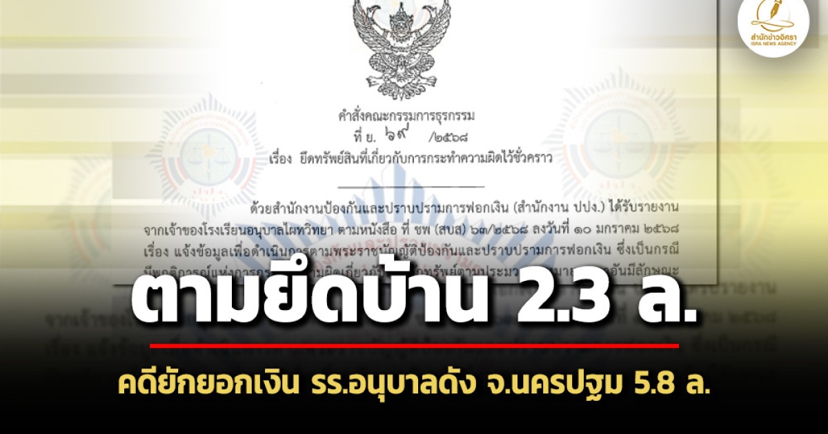 ปปง.ตามยึดที่ดินสิ่งปลูกสร้าง 1 แปลง 2.3 ล. คดี ‘ปริศนา ดวงจินดา’ จนท.การเงิน รร.อนุบาลไผทวิทยา จ.นครปฐม ยักยอกค่าเล่าเรียนเด็ก 5.8 ล้าน หลังผู้จัดทำบัญชีตรวจสอบพบนำส่งรายได้เข้าบัญชีล่าช้าผิดปกติ แจ้งความตร. คดีอยู่ในชั้นศาล หลังประกาศให้ผู้เสียหายยื่นขอชดใช้คืน
