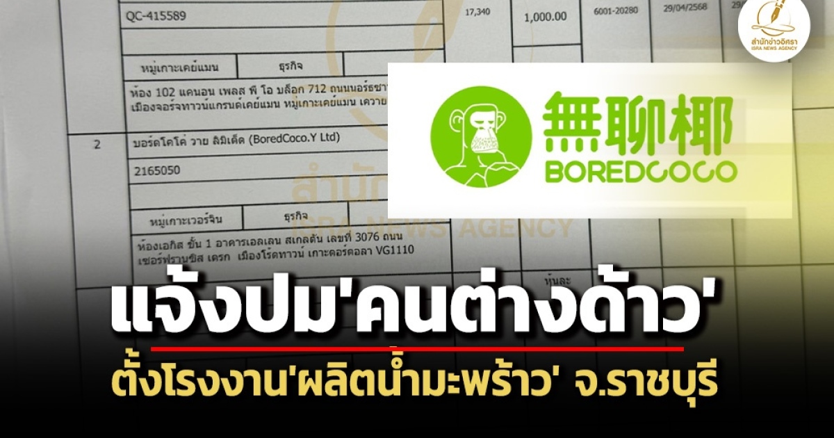 ในขณะที่ข้อมูลจากกรมพัฒนาธุรกิจการค้า ระบุว่า บริษัท บอร์ด โคโค่นัท จำกัด จดทะเบียนจัดตั้งเมื่อวันที่ 22 พ.ค.2566 ทุนจดทะเบียนล่าสุด 34 ล้านบาท สำนักงานใหญ่ตั้งอยู่เลขที่ 334 หมู่ที่ 8 ต.ดอนกรวย อ.ดำเนินสะดวก จ.ราชบุรี สำนักงานสาขา ตั้งอยู่ (1) เลขที่ 154 หมู่ที่ 10 ต.วัดแก้ว อ.บางแพ จ.ราชบุรี แจ้งลักษณะธุรกิจ (ล่าสุด) คือ ประกอบกิจการโรงงานอุตสาหกรรม แปรรูปอาหารและเครื่องดื่มน้ำผลไม้จากผลผลิตการเกษตร ส่งออก