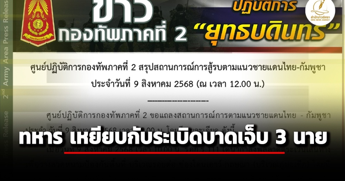 สำนักข่าวอิศรา (www.isranews.org) รายงานว่า วันที่ 9 สิงหาคม 2568 เพจกองทัพภาคที่ 2 โพสต์เอกสารข่าวกองทัพภาคที่ 2 ปฏิบัติการ ‘ยุทธบดินทร์’ โดยศูนย์ปฏิบัติการกองทัพภาคที่ 2 แถลงสถานการณ์การตามแนวชายแดนไทย - กัมพูชา ประจำวันที่วันที่ 9 สิงหาคม 2568 เวลา 12.00 น. กำลังพล ร้อย.ร.111 จำนวน 3 นาย ลาดตระเวนบริเวณภูมะเขือ เหยียบกับระเบิด ส่งผลให้มีทหารบาดเจ็บ 3 นาย โดยหัวหน้าชุด บาดเจ็บสาหัส ข้อเท้าซ้ายท่อนล่างขาด โดยมีรายละเอียด ดังนี้