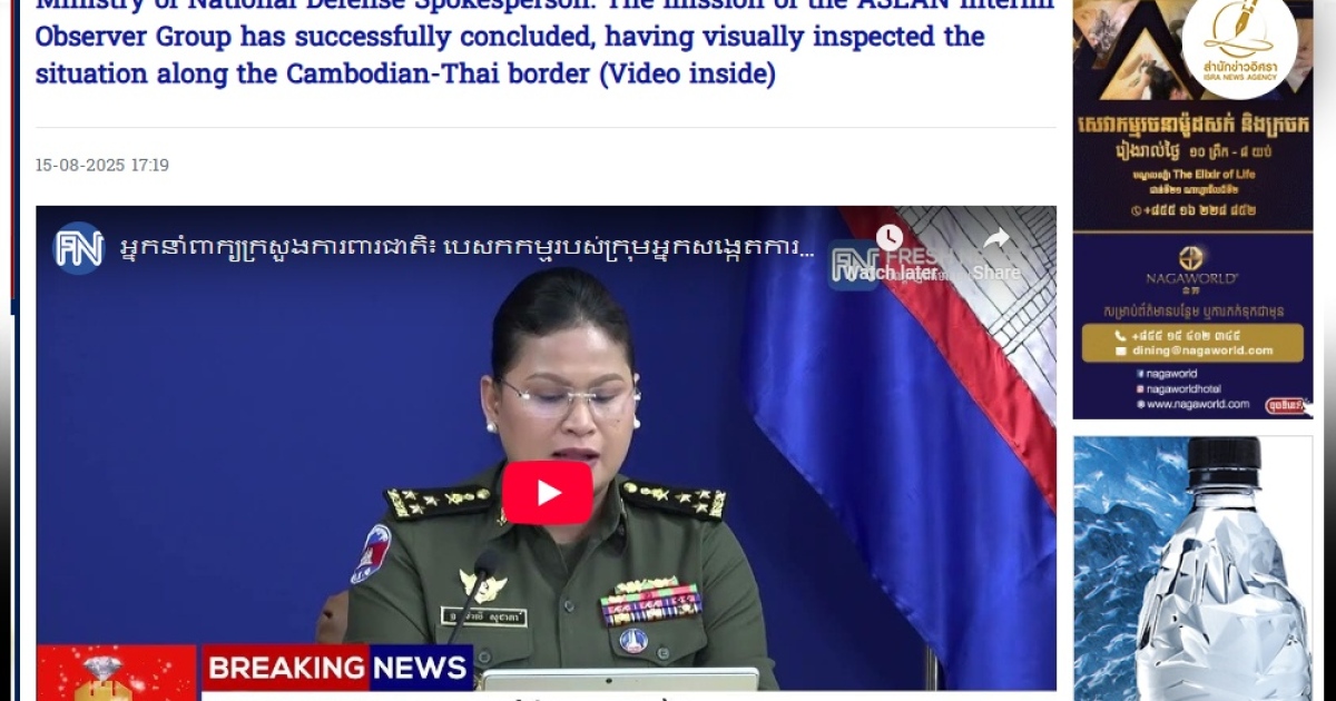 กัมพูชาแถลงผลภารกิจผู้สังเกตการณ์อาเซียนลงพื้นที่พรมแดนประสบความสำเร็จ เตรียมจัดตั้งสำนักงานใหญ่ทีมผู้สังเกตการณ์ที่พระวิหาร-บันเตียเมียนเจย ย้ำอีกรอบฝ่ายไทยเพิ่มกำลังทหาร-วางรั้วลวดหนามหลังตกลงหยุดยิงแล้ว