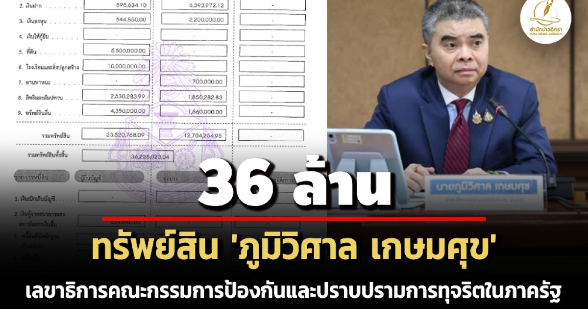 สำนักข่าวอิศรา (www.isranews.org) รายงานว่า เมื่อวันที่ 19 ส.ค. 2568 สำนักงานคณะกรรมการการป้องกันและปราบการทุจริตแห่งชาติ (ป.ป.ช.) เปิดเผยบัญชีแสดงรายการทรัพย์สินและหนี้สินของผู้ดำรงตำแหน่งระดับสูง ราย นายภูมิวิศาล เกษมศุข เลขาธิการคณะกรรมการป้องกันและปราบปรามการทุจริตในภาครัฐ (ป.ป.ท.) และกรรมการผู้ทรงคุณวุฒิในคณะกรรมการป้องกันและปราบปรามการฟอกเงิน (ปปง.) กรณีทุกสามปีตลอดเวลาที่ยังดำรงตำแหน่งเป็นเจ้าหน้าที่ของรัฐ เมื่อวันที่ 28 พ.ค. 2568