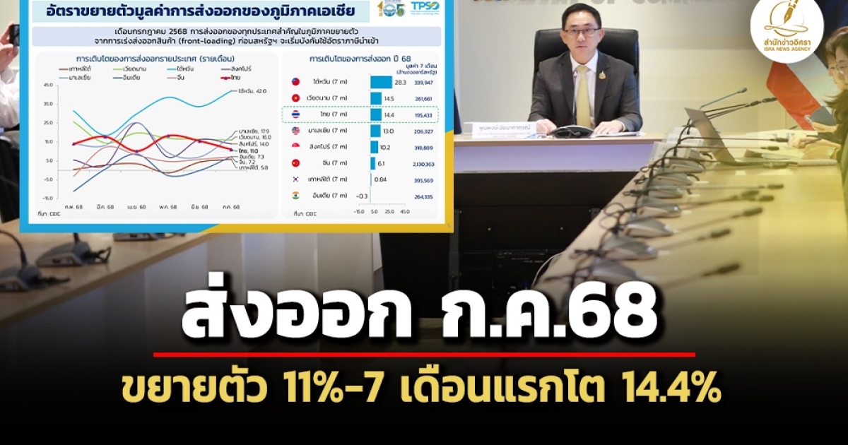 ‘พาณิชย์’ เผยส่งออกไทย ก.ค.68 ขยายตัว 11% เหตุ ‘ผู้ซื้อ’ เร่งรัด ‘นำเข้า’ ปิดความเสี่ยงมาตรการ ‘ภาษีสหรัฐ’ ส่งผลให้ยอด 7 เดือนแรก โต 14.4% คาดส่งออกในช่วง 5 เดือนที่เหลือของปีนี้ ‘ชะลอตัว’