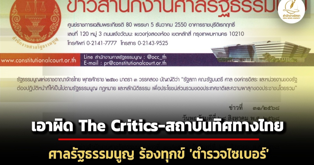 สำนักงานศาลรัฐธรรมนูญ ร้องทุกข์ กองบัญชาการตำรวจสืบสวนสอบสวนอาชญากรรมทางเทคโนโลยี ดำเนินการทางกฎหมายกับ เฟซบุ๊ก The Critics-ยูทูปว์ สถาบันทิศทางไทย เผยแพร่ข่าวอันเป็นเท็จ-บิดเบือนข้อเท็จจริงในกระบวนการไต่สวน ข้อหากระทำความผิด พ.ร.บ. คอมพิวเตอร์ฯ