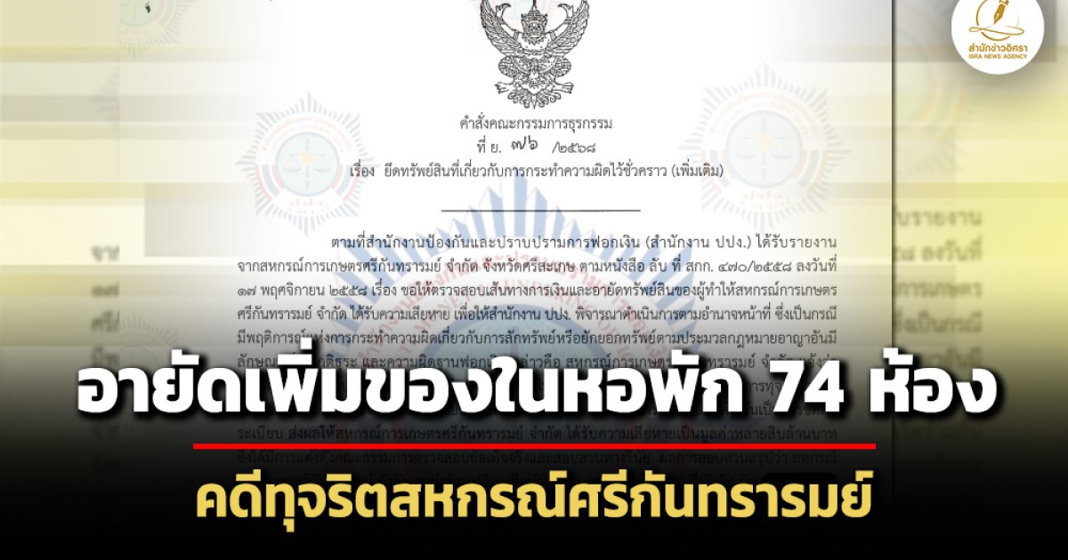 ก่อนหน้าโดนที่ดิน 6 แปลง 59.5 ล.! ปปง.ตามอายัดเพิ่มเครื่องใช้ไฟฟ้าในหอพัก 74 ห้อง จ.ศรีสะเกษ อดีต ผจก. คดีทุจริตสหกรณ์ศรีกันทรารมย์ ทำเอกสารซื้อขายข้าวเปลือกเท็จ เสียหาย 55 ล้าน หลังศาลพิพากษาจำคุก