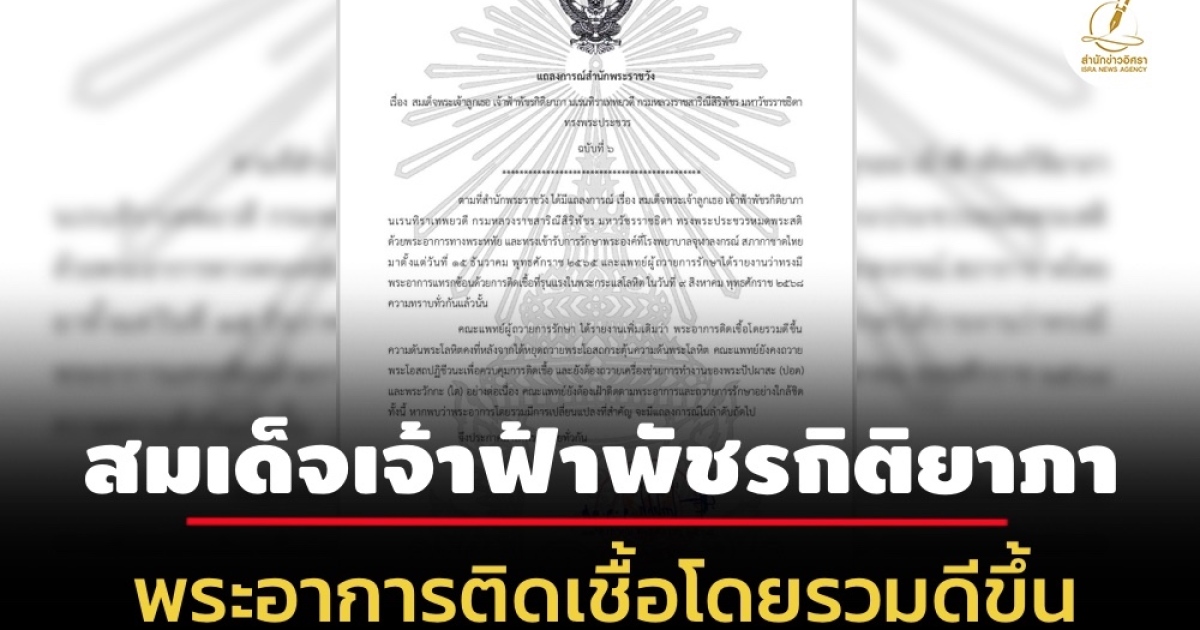 แถลงการณ์สำนักพระราชวัง 'สมเด็จเจ้าฟ้าพัชรกิติยาภา' พระอาการติดเชื้อโดยรวมดีขึ้น คณะแพทย์ต้องถวายการรักษาอย่างใกล้ชิด