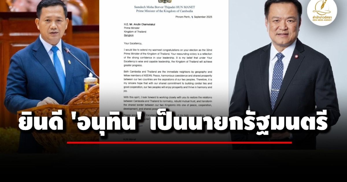 สำนักข่าวอิศรา (www.isranews.org) รายงานว่า เมื่อวันที่ 7 ก.ย. 2568 นายฮุน มาเนต นายกรัฐมนตรีกัมพูชา โพสต์ภาพแถลงการณ์เป็นภาษาอังกฤษแสดงความยินดีกับนายอนุทิน ชาญวีรกูล ที่ได้รับเลือกให้ดำรงตำแหน่งนายกรัฐมนตรี คนที่ 32 ของประเทศไทย ผ่านเฟซบุ๊ก Hun Manet