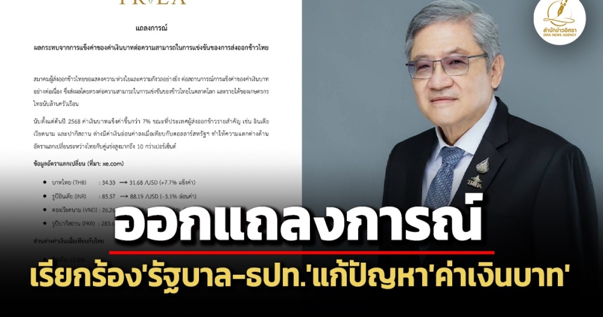‘สมาคมผู้ส่งออกข้าวไทย’ ออกแถลงการณ์เรียกร้อง ‘รัฐบาล-ธปท.’ ออกมาตรการเร่งด่วน กด ‘บาทอ่อน’ สู่ระดับแข่งขันได้ ชี้หากแก้ไม่ได้ส่อกระทบรายได้ 'ชาวนา' นับล้านราย