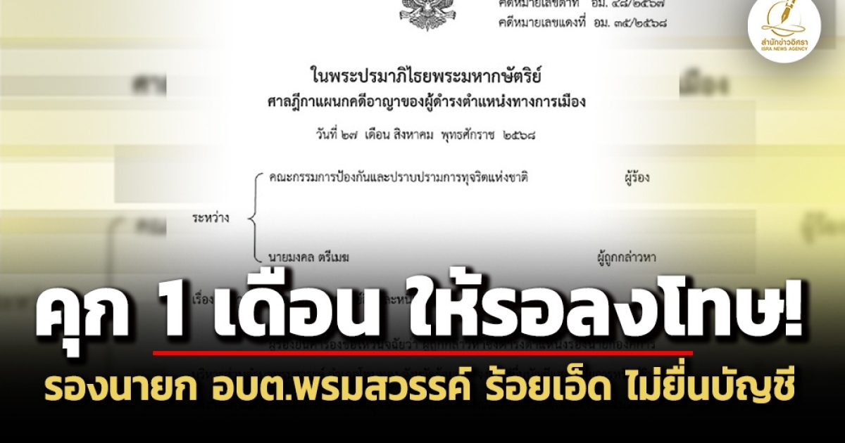สำนักข่าวอิศรา (www.isranews.org) รายงานว่า วันที่ 27 สิงหาคม 2568 ศาลฎีกาแผนกคดีอาญาของผู้ดำรงตำแหน่งทางการเมือง พิพากษาว่า นายมงคล ตรีเมฆ รองนายกองค์การบริหารส่วนตำบล (อบต.) พรมสวรรค์ อำเภอโพนทอง จังหวัดร้อยเอ็ด ผู้ถูกกล่าวหา จงใจไม่ยื่นบัญชีแสดงรายการทรัพย์สินและหนี้สินและเอกสารประกอบต่อคณะกรรมการป้องกันและปราบปรามการทุจริตแห่งชาติ (คณะกรรมการ ป.ป.ช.) ภายในเวลาที่กฎหมายกำหนด และมีพฤติการณ์อันควรเชื่อได้ว่ามีเจตนาไม่แสดงที่มาแห่งทรัพย์สินหรือหนี้สิน กรณีพ้นจากตำแหน่งรองนายก อบต.พรมสวรรค์ ให้เพิกถอนสิทธิสมัครรับเลือกตั้งของผู้ถูกกล่าวหาตลอดไป จําคุก 2 เดือน และปรับ 8,000 บาท ผู้ถูกกล่าวหาให้การรับสารภาพ เป็นประโยชน์แก่การพิจารณา มีเหตุบรรเทาโทษ ลดโทษให้กึ่งหนึ่ง คงจําคุก 1 เดือน และปรับ 4,000 บาทไม่ปรากฏว่าผู้ถูกกล่าวหา เคยได้รับโทษจําคุกมาก่อน โทษจําคุกจึงให้รอการลงโทษไว้มีกำหนด 1 ปี รายละเอียดดังนี้