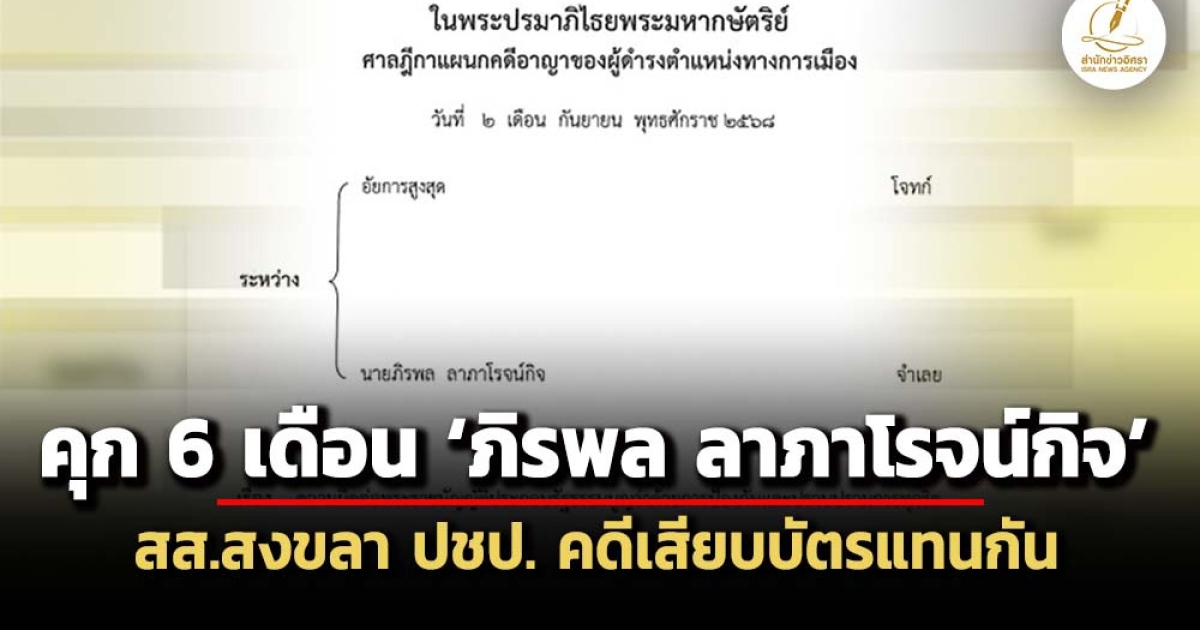 สำนักข่าวอิศรา www.isranews.org รายงานว่า เมื่อวันที่ 2 กันยายน 2568 ศาลฎีกาแผนกคดีอาญาของผู้ดำรงตำแหน่งทางการเมือง พิพากษา คดีหมายเลขแดงที่ อม 37/2568 ระหว่างอัยการสูงสุดโจทก์ ระหว่าง นายภิรพล ลาภาโรจน์กิจ จำเลย ดำรงตำแหน่งสมาชิกสภาผู้แทนราษฎร แบบแบ่งเขตเลือกตั้ง จังหวัดสงขลา สังกัดพรรคประชาธิปัตย์ เรื่อง ความผิดต่อพระราชบัญญัติประกอบรัฐธรรมนูญว่าด้วยการป้องกันและปราบปรามการทุจริต กรณีเสียบบัตรลงคะแนนแทนกัน ในการพิจารณาและลงมติร่างพระราชบัญญัติให้อำนาจกระทรวงการคลังกู้เงินเพื่อการพัฒนาโครงสร้าง พื้นฐานด้านคมนาคมขนส่งของประเทศ พ.ศ. …. จำเลยมีความผิดตามพระราชบัญญัติประกอบรัฐธรรมนูญว่าด้วยการป้องกันและปราบปรามการทุจริต พ.ศ. 2542 มาตรา 123/1 จำคุก 1 ปี จำเลยให้การรับสารภาพเป็นประโยชน์แก่การพิจารณา มีเหตุบรรเทาโทษ ลดโทษให้กึ่งหนึ่ง คงจำคุก 6 เดือน องค์คณะผู้พิพากษาเสียงข้างมากเห็นว่า ขณะกระทำความผิดจำเลยเป็นผู้ดำรงตำแหน่งทางการเมือง ต้องปฏิบัติหน้าที่ด้วยความซื่อสัตย์สุจริต เพื่อประโยชน์ส่วนรวมของปวงชนชาวไทย แต่กลับกระทำความผิดต่อตำแหน่งหน้าที่โดยมิชอบ พฤติการณ์แห่งคดีเป็นเรื่องร้ายแรง แม้ไม่ปรากฏว่าจำเลยเคยได้รับโทษจำคุกมาก่อน หรือมีเหตุอื่นตามคำแถลงประกอบิคำรับสารภาพของจำเลย ก็ยังไม่มีเหตุเพียงพอที่จะรอการกำหนดโทษหรือรอการลงโทษให้แก่จำเลยได้
