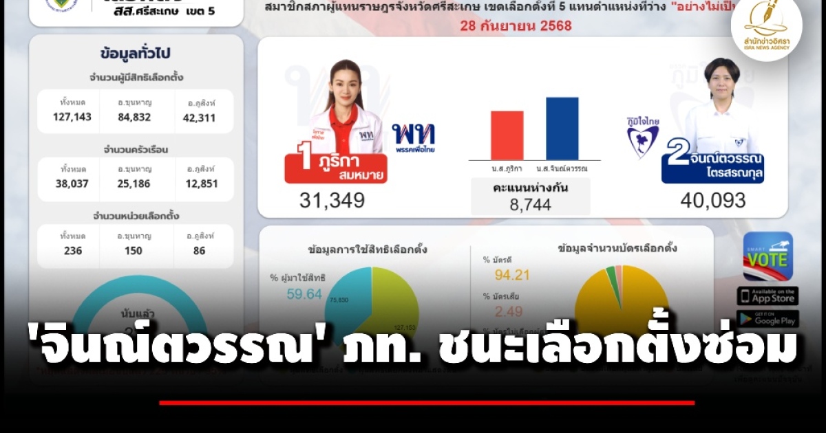 สำนักข่าวอิศรา (www.isranews.org) รายงานว่า เมื่อวันที่ 28 กันยายน 2568 สำนักงานคณะกรรมการการเลือกตั้ง (กกต.) จัดการเลือกตั้งซ่อม สส.ศรีสะเกษ เขต 5 ภายหลังปิดหีบลงคะแนนเมื่อเวลา 17.00 น. ผลการนับคะแนนอย่างไม่เป็นทางการปรากฏว่า นางสาวจินณ์ตวรรณ ไตรสรณกุล ผู้สมัครหมายเลข 2 จากพรรคภูมิใจไทย มีคะแนนเป็นอันดับ 1 ได้ 40,093 คะแนน ขณะที่ นางสาวภูริกา สมหมาย ผู้สมัครหมายเลข 1 จากพรรคเพื่อไทย ได้ 31,349 คะแนน