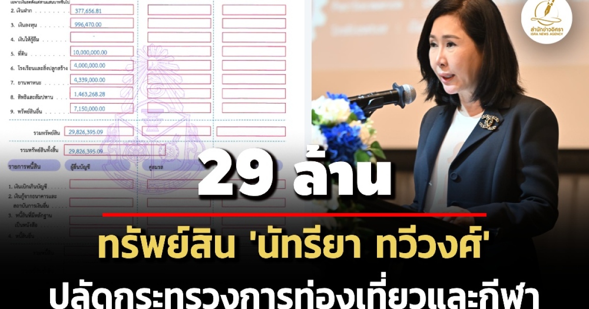 ป.ป.ช. เปิดทรัพย์สินผู้ดำรงตำแหน่งระดับสูง 'นันทรียา ทวีวงศ์' ปลัดกระทรวงการท่องเที่ยวและกีฬา ทรัพย์สิน 29 ล. มีที่ดินในกทม. 1 แปลง 10 ล. รายได้ 1.8 ล./ปี ไร้หนี้สิน