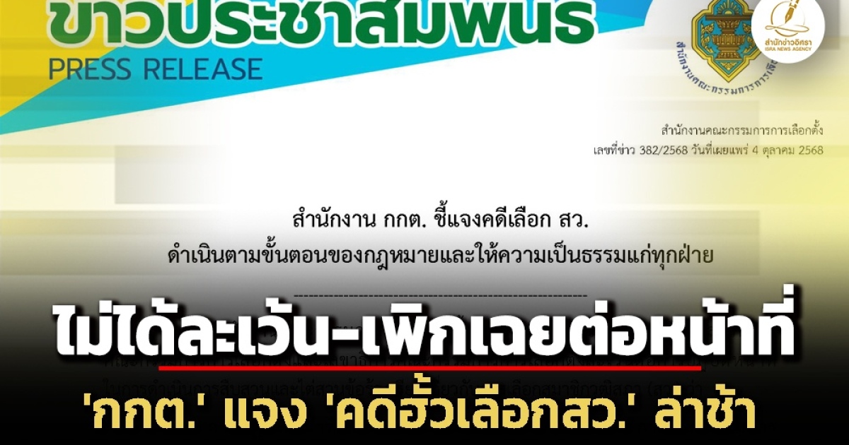 สำนักข่าวอิศรา (www.isranews.org) รายงานว่า วันที่ 4 ตุลาคม 2568 สำนักงานคณะกรรมการการเลือกตั้ง (กกต.) เผยแพร่เอกสารข่าวประชาสัมพันธ์ (PRESS RELEASE) เลขที่ข่าว 382/2568 ชี้แจงกรณีคดีเลือกสมาชิกวุฒิสภา (สว.) ดำเนินการตามขั้นตอนของกฎหมายและให้ความเป็นธรรมแก่ทุกฝ่าย ว่า การปฏิบัติหน้าที่ของคณะกรรมการ กกต. เลขาธิการคณะกรรมการกกต. และสำนักงานคณะกรรมการกกต. เป็นไปตามกระบวนการของกฎหมายทุกขั้นตอน มิได้ละเว้นหรือเพิกเฉยต่อหน้าที่เพื่อให้เรื่องล่าช้าแต่อย่างใด การพิจารณาทุกสำนวนดำเนินไปด้วยความรอบคอบ โปร่งใส และคุ้มครองสิทธิและให้ความเป็นธรรมทุกฝ่าย เพื่อสร้างความเชื่อมั่นแก่สังคมว่าผลการวินิจฉัยจะเป็นไปโดยสุจริต เที่ยงธรรม และชอบด้วยกฎหมาย