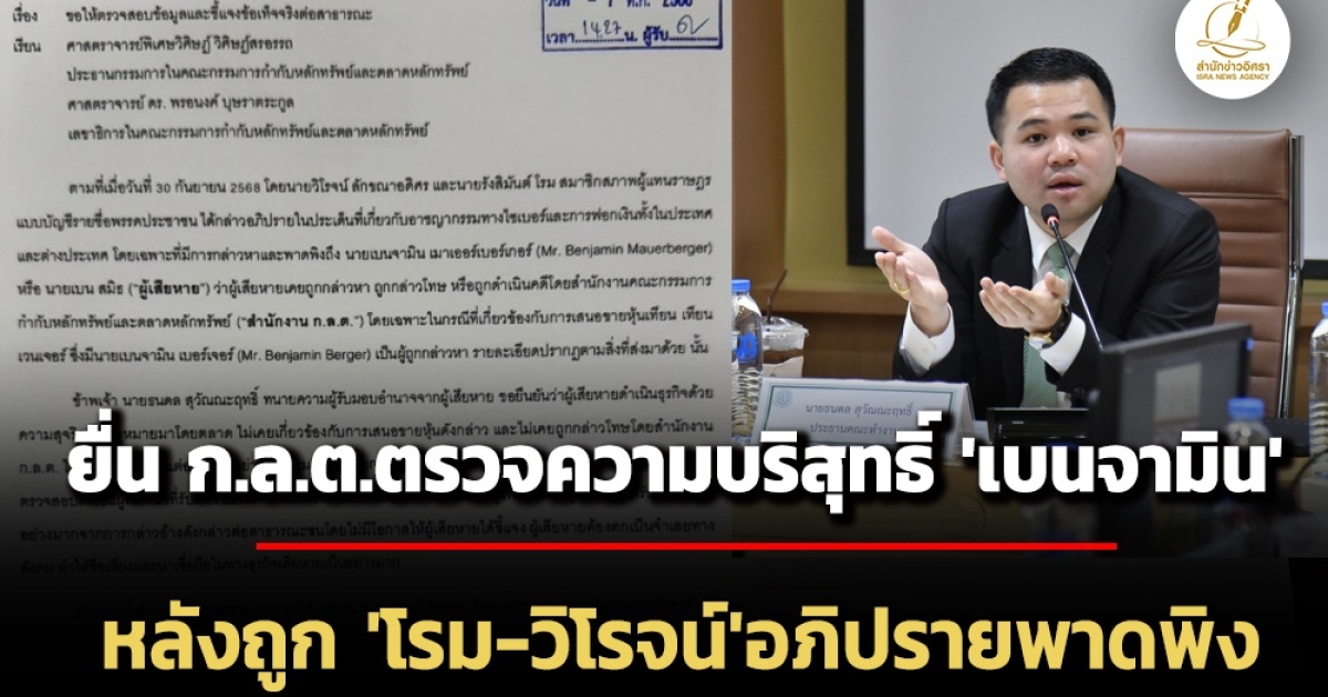 ที่ปรึกษา 'ธรรมนัส' ยื่นหนังสือ ก.ล.ต.ตรวจสอบความบริสุทธิ์ 'เบนจามิน' หลัง 'โรม-วิโรจน์' อภิปรายพาดพิงโยงเป็นคนเดียวกับผู้ต้องหาคดีเสนอขายหุ้น 'เทียน เทียน เวนเจอร์' เผยลูกความมีความเสียหายมาก เลยขอให้ยื่นผลการตรวจสอบภายใน 3 วัน