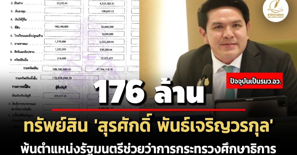 ป.ป.ช. เปิดทรัพย์สินผู้ดำรงตำแหน่งรัฐมนตรี 'สุรศักดิ์ พันธ์เจริญวรกุล' รัฐมนตรีว่าการกระทรวงอว. กรณีพ้นตำแหน่งรัฐมนตรีช่วยว่าการกระทรวงศึกษาธิการ ทรัพย์สิน 176 ล. รายได้ 1.3 ล./ปี