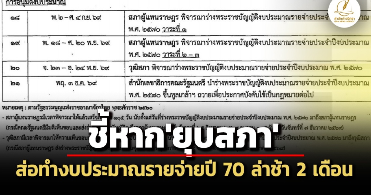 @ชี้หาก‘ยุบสภา’ส่อทำงบประมาณปี 70 ล่าช้า 2 เดือน