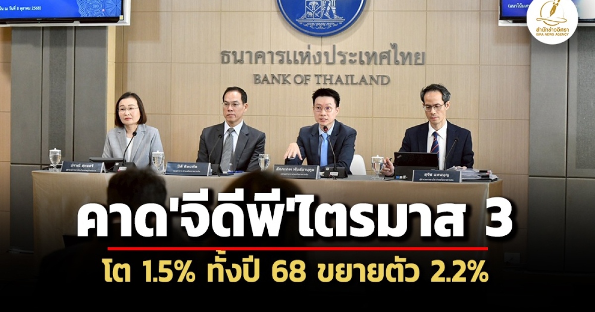 ‘ธปท.’คาดเศรษฐกิจไทยไตรมาส 3/68 ขยายตัว 1.5% ก่อนชะลอตัวเหลือ 1.3% ในช่วงไตรมาส 4/68 ส่งผลให้จีดีพีทั้งปี 68 โต 2.2% ระบุ SMEs ยังคงลำบาก จากปัญหาเชิงโครงสร้าง-เผชิญการแข่งขันสูง พร้อมย้ำความเสี่ยง ‘เงินฝืด’ ยังอยู่ในระดับต่ำ แม้ว่าคาด ‘เงินเฟ้อทั่วไป’ จะกลับมาเป็นบวกในช่วงไตรมาส 2 ปีหน้า