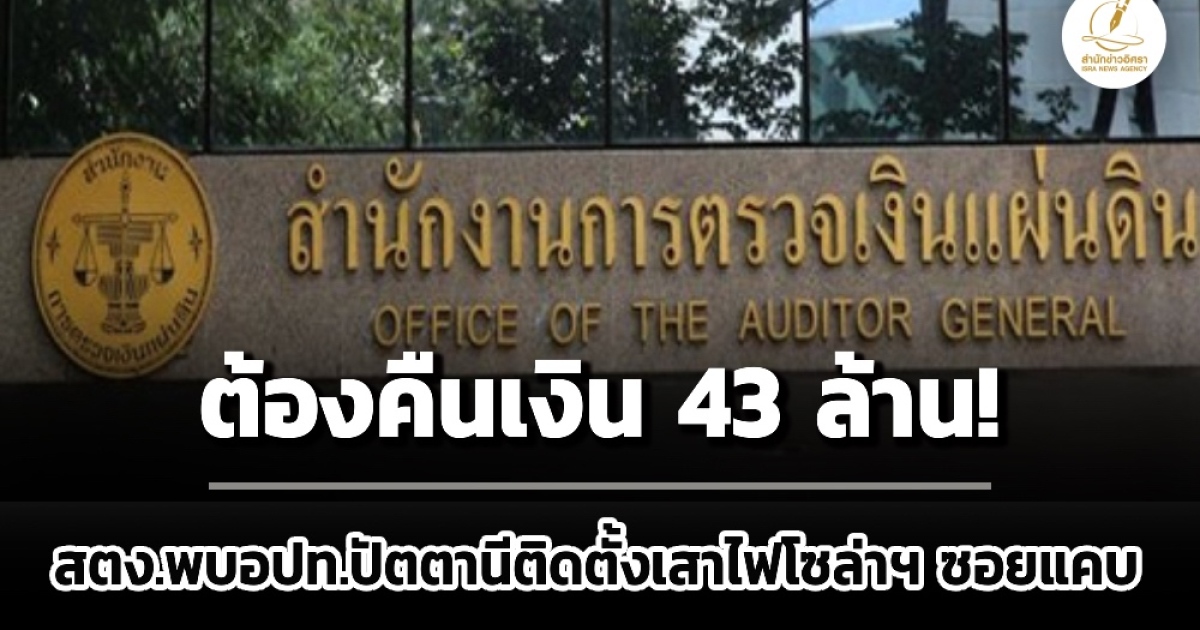 สตง. ตรวจปัญหาติดตั้งโครงการเสาไฟโซลล่าเซลล์ปัตตานีในซอยแคบ-สวนยางพารามีร่มเงามาก แสงอาทิตย์ส่องไม่ถึง พบอปท.ปรับจุดติดตั้งแล้ว-ปัญหาของบประมาณพัฒนาแหล่งท่องเที่ยว แต่ใช้งบไม่ตรงตามวัตถุประสงค์ หน่วยงานที่เกี่ยวข้องคืนงบกว่า 43 ล. ให้กรมส่งเสริมการปกครองท้องถิ่น