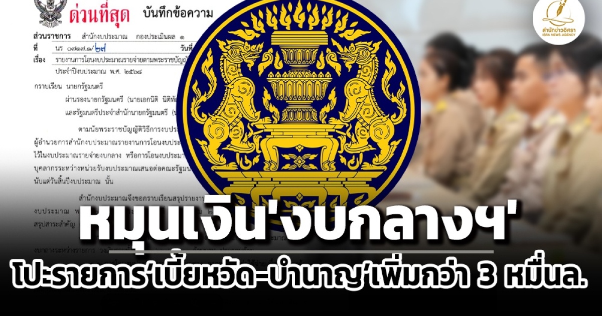 ครม.รับทราบโยกงบกลางฯ ‘รายการเงินสํารอง-เงินสมทบ-เงินชดเชยของข้าราชการฯ’ โปะ ‘เบี้ยหวัด-บำเหน็จ-บํานาญ’ กว่า 3 หมื่นล้าน ดันงบรายการเบี้ยหวัด-บำนาญฯ ปีงบ 68 เพิ่มเป็น 3.86 แสนล้านบาท