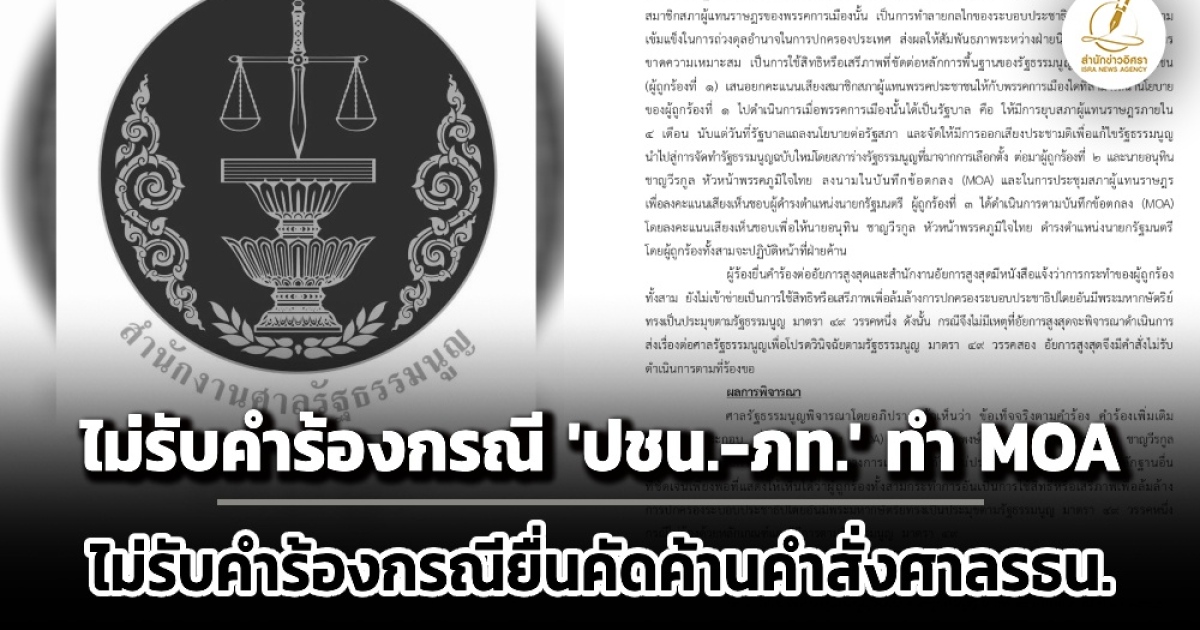 ศาลรัฐธรรมนูญมติเอกฉันท์ไม่รับ 2 คำร้องกรณี 'ปชน.-ภท.' ทำ MOA เลือกนายกฯแลกยุบสภาภายใน 4 เดือน ชี้ไม่ปรากฏข้อเท็จจริงว่าใช้สิทธิเสรีภาพล้มล้างการปกครอง-ไม่รับคำร้องกรณี 'พันตำรวจตรี ชาตรี เขียวภักดี' คัดค้านคำสั่งศาล ชี้ไม่มีบทบัญญัติใดให้บุคคลมีสิทธิอุทธรณ์คำวินิจฉัย-คำสั่งศาลรธน.