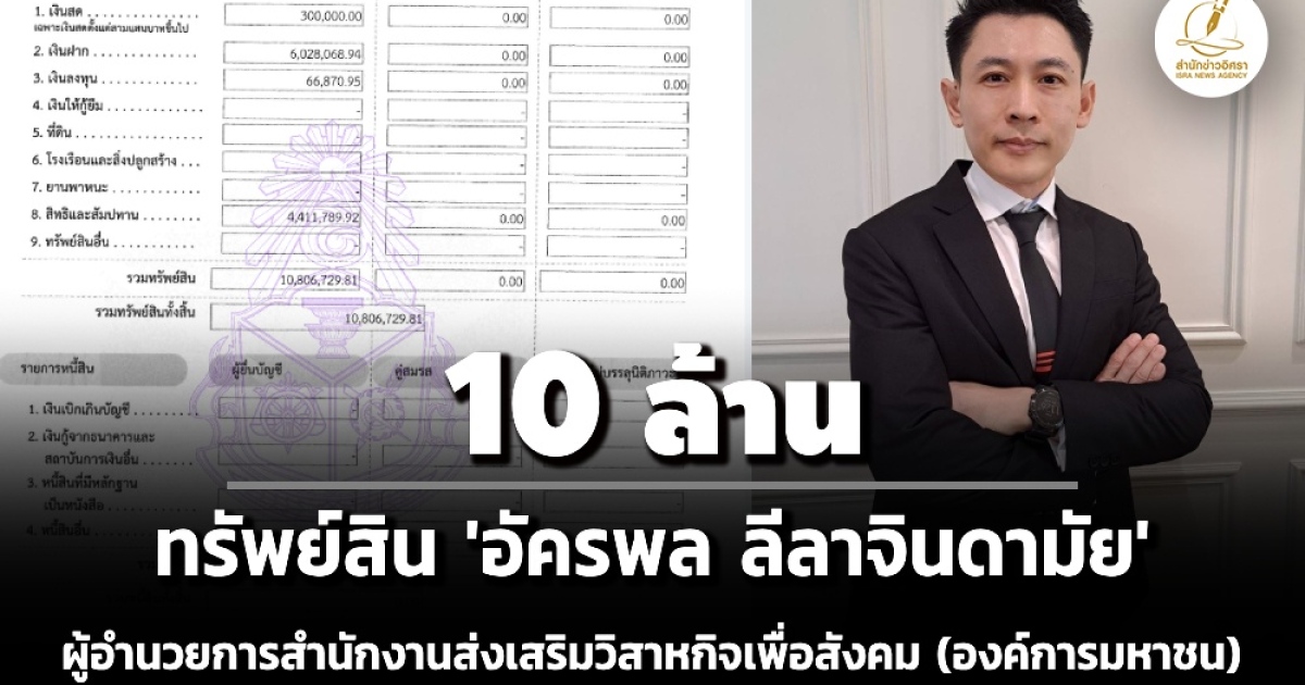 สำนักข่าวอิศรา (www.isranews.org) รายงานว่า เมื่อเร็ว ๆ นี้ สำนักงานคณะกรรมการการป้องกันและปราบการทุจริตแห่งชาติ (ป.ป.ช.) เปิดเผยบัญชีแสดงรายการทรัพย์สินและหนี้สินผู้ดำรงตำแหน่งระดับสูง ราย นายอัครพล ลีลาจินดามัย ผู้อำนวยการสำนักงานส่งเสริมวิสาหกิจเพื่อสังคม (องค์การมหาชน) (สวส.) กรณีเข้ารับตำแหน่ง เมื่อวันที่ 1 ก.ย. 2568