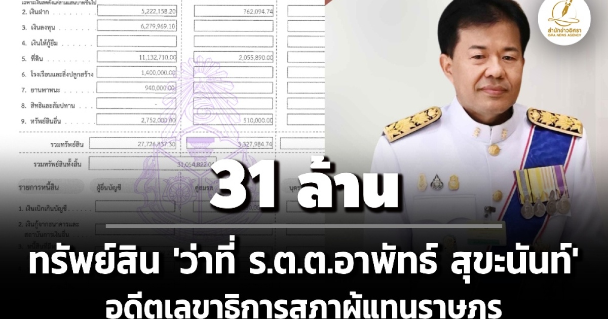 ป.ป.ช. เปิดทรัพย์สินผู้ดำรงตำแหน่งระดับสูง 'ว่าที่ ร.ต.ต.อาพัทธ์ สุขะนันท์' อดีตเลขาธิการสภาผู้แทนราษฎร ทรัพย์สิน 31 ล. ที่ดิน 11 ล. รายได้ 3.1 ล./ปี