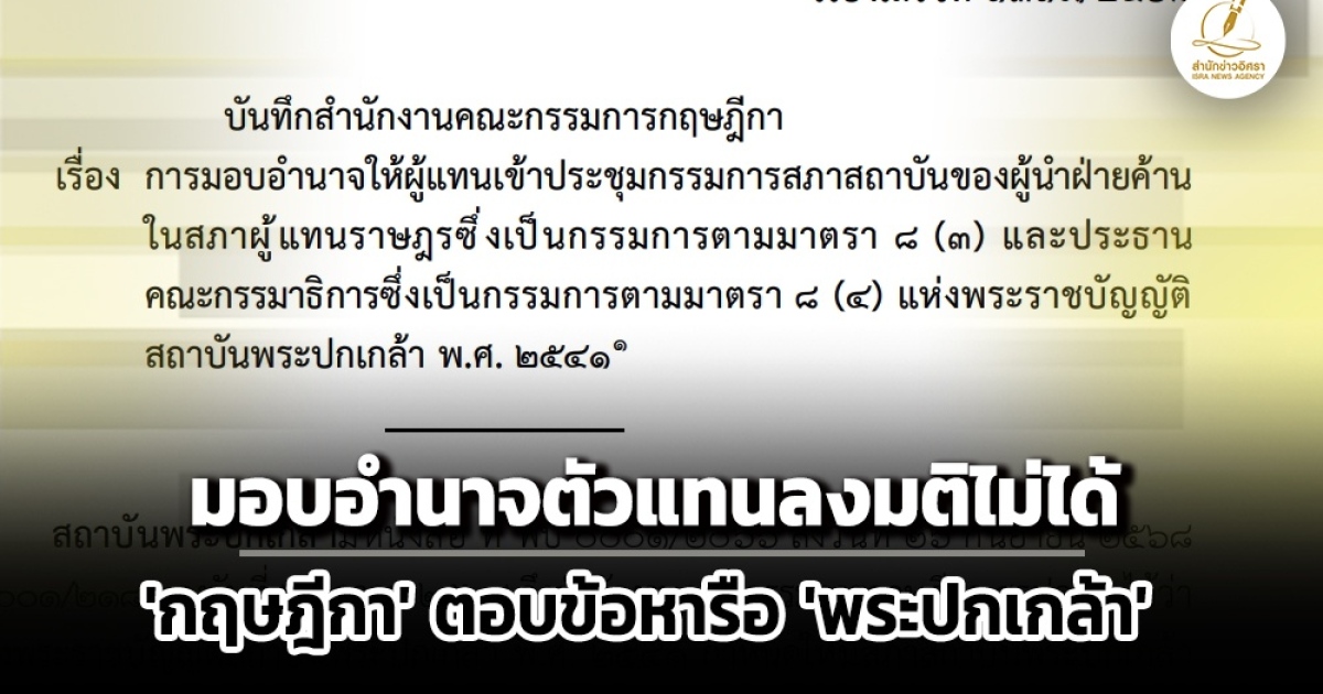 สำนักข่าวอิศรา (www.isranews.org) รายงานว่า เมื่อเร็วๆ นี้สำนักงานคณะกรรมการกฤษฎีกา เผยแพร่ เรื่องเสร็จที่ 1319/2568 บันทึกสำนักงานคณะกรรมการกฤษฎีกา เรื่อง การมอบอำนาจให้ผู้แทนเข้าประชุมกรรมการสภาสถาบันของผู้นำฝ่ายค้านในสภาผู้แทนราษฎร และประธานคณะกรรมาธิการ (กมธ.) ซึ่งเป็นกรรมการตามพระราชบัญญัติ (พ.ร.บ.) สถาบันพระปกเกล้า พ.ศ.2541 มาตรา 8 (3) และมาตรา 8 (4) ตามลำดับ ว่า กรรมการสภาสถาบันพระปกเกล้าดังกล่าว กรณีผู้นำฝ่ายค้านฯ การปฏิบัติหน้าที่กรรมการสภาสถาบันโดยตำแหน่งของผู้นำฝ่ายค้านฯ มีลักษณะเป็นการเฉพาะตัว เป็นการปฏิบัติหน้าที่เฉพาะตัว ไม่สามารถมอบอำนาจให้ผู้อื่นเข้าประชุมแทนในฐานะกรรมการสภาสถาบันที่จะออกเสียงลงคะแนน ลงมติและรับเบี้ยประชุมหรือประโยชน์ตอบแทนอย่างอื่นได้