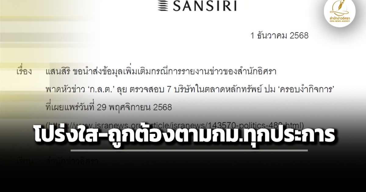 สำนักข่าวอิศรา (www.isranews.org) รายงานว่า วันที่ 1 ธันวาคม 2568 บมจ.แสนสิริ ได้ทำหนังสือถึงสำนักข่าวอิศราชี้แจงกรณีดังกล่าวว่า จากการตรวจสอบข้อมูลต่างๆ ภายในบริษัท พบว่า บริษัทไม่ได้ถูกตรวจสอบจาก ก.ล.ต. รวมทั้งไม่ได้รับการติดต่อจาก ก.ล.ต. ในประเด็นข่าวข้างต้นและประเด็นอื่นๆ แต่อย่างใด