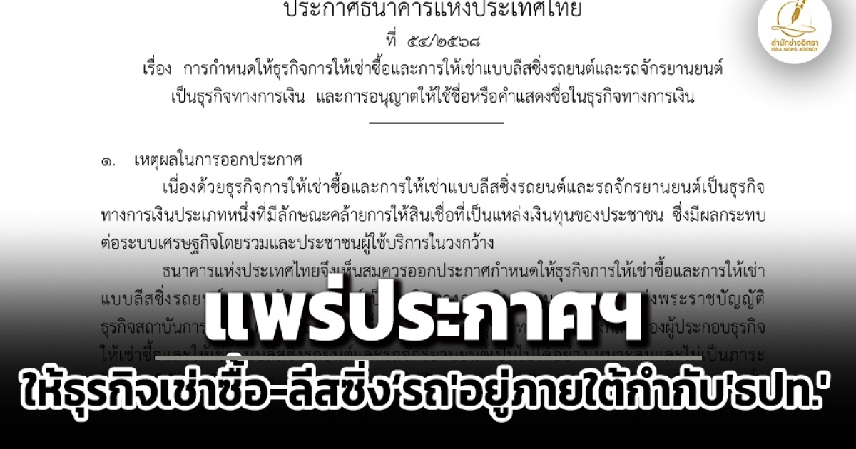 สำนักข่าวอิศรา (www.isranews.org) รายงานว่า เมื่อวันที่ 1 ธ.ค.ที่ผ่านมา เว็บไซต์ราชกิจจานุเบกษาได้เผยแพร่ประกาศธนาคารแห่งประเทศไทย ที่ 54/2568 เรื่อง การกำหนดให้ธุรกิจการให้เช่าซื้อและการให้เช่าแบบลีสซิ่งรถยนต์และรถจักรยานยนต์เป็นธุรกิจทางการเงิน และการอนุญาตให้ใช้ชื่อหรือคำแสดงชื่อในธุรกิจทางการเงิน ทั้งนี้ ประกาศฯฉบับดังกล่าว ให้มีผลบังคับใช้ตั้งแต่วันที่ 2 ธ.ค.2568 เป็นต้นไป