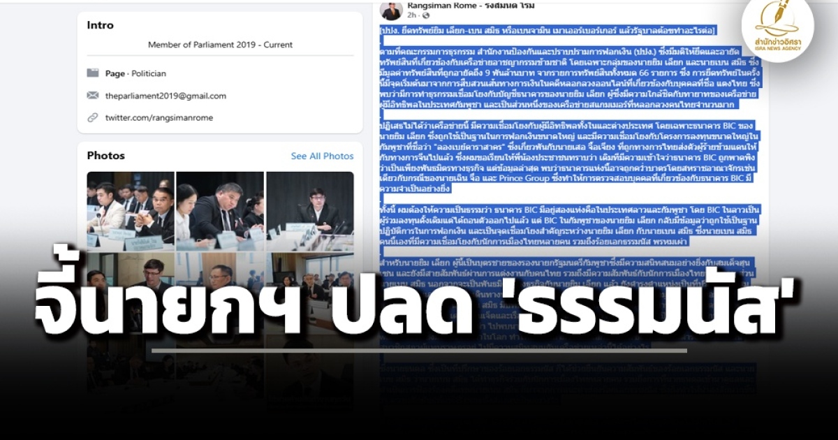 ‘โรม’ โพสต์เฟซย้ำต้องตรวจสอบความเชื่อมโยงธนาคาร BIC ถึงนักการเมืองหลัง ปปง.เดินหน้ายึดทรัพย์เครือข่าย ‘ยิม เลียก-เบน สมิธ’ จี้ นายกฯ ปลด ‘ธรรมนัส’ ออกจากตำแหน่งรองนายกฯ-รมต.เกษตรฯ เหตุเพราะหากอยู่ในตำแหน่งอาจกระทบการทำงานเจ้าหน้าที่ ยอมรับในคดี ‘เบน-สมิธ’ ฟ้องหมิ่น พบข้อพิรุธเพียบ ทั้งเรื่องทนายไม่ทราบเรื่องการมอบอำนาจ-ยืนยันตัวตามหนังสือเดินทางไม่ได้
