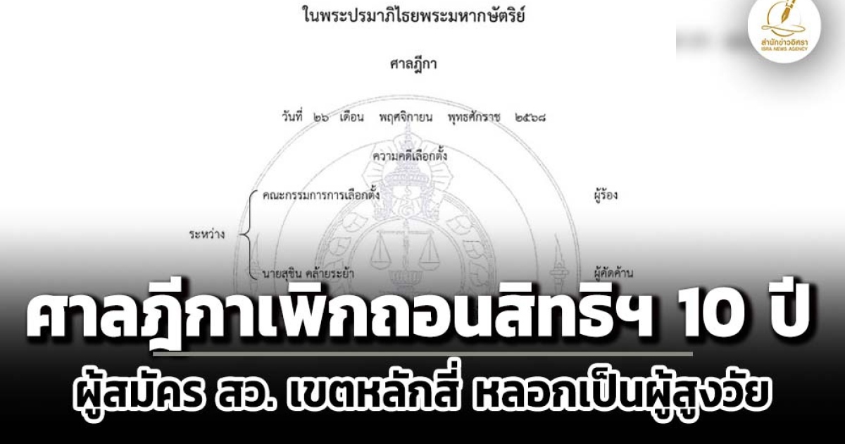 ศาลฎีกา พิพากษาให้เพิกถอนสิทธิสมัครรับเลือกตั้ง 10 ปี ‘สุชิน คล้ายระย้า’ ผู้สมัคร สว.ระดับอำเภอ เขตหลักสี่ กรุงเทพฯ กลุ่มที่ 15 อายุ 55 ปี ให้ข้อมูลเท็จ กรอกใบสมัครอ้างวัย 60 ปี แท้จริงมิใช่ผู้สูงวัย ไม่เป็นคนพิการ ทุพพลภาพ กระทำทุจริตจูงใจให้บุคคลอื่นเข้าใจผิดในคุณสมบัติลงคะแนน
