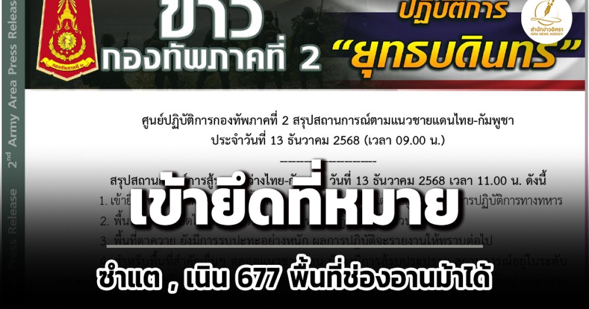 • กองทัพสรุปสถานการณ์แนวปะทะชายแดนไทยกัมพูชา ยึดที่หมาย ‘ซำแต-เนิน 677’ ได้แล้ว