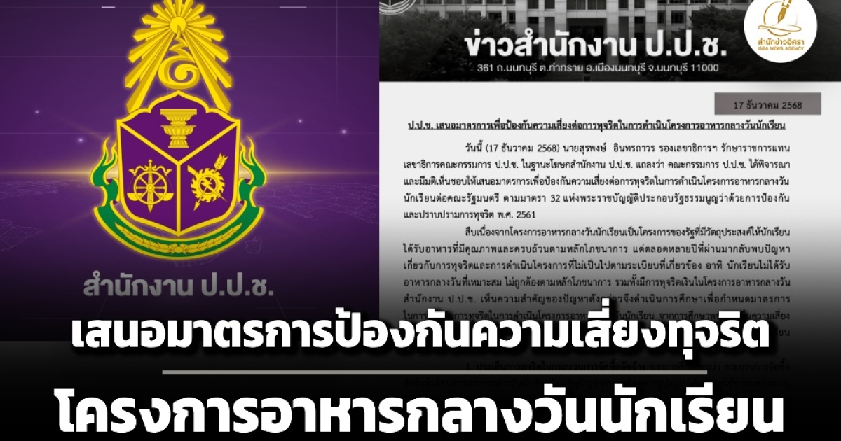 สำนักข่าวอิศรา (www.isranews.org) รายงานว่า เมื่อวันที่ 17 ธ.ค. 2568 นายสุรพงษ์ อินทรถาวร รองเลขาธิการฯ รักษาราชการแทนเลขาธิการคณะกรรมการ ป.ป.ช. ในฐานะโฆษกสำนักงาน ป.ป.ช. แถลงว่า คณะกรรมการ ป.ป.ช. ได้พิจารณาและมีมติเห็นชอบให้เสนอมาตรการเพื่อป้องกันความเสี่ยงต่อการทุจริตในการดำเนินโครงการอาหารกลางวันนักเรียนต่อคณะรัฐมนตรี ตามมาตรา 32 แห่งพระราชบัญญัติประกอบรัฐธรรมนูญว่าด้วยการป้องกันและปราบปรามการทุจริต พ.ศ. 2561