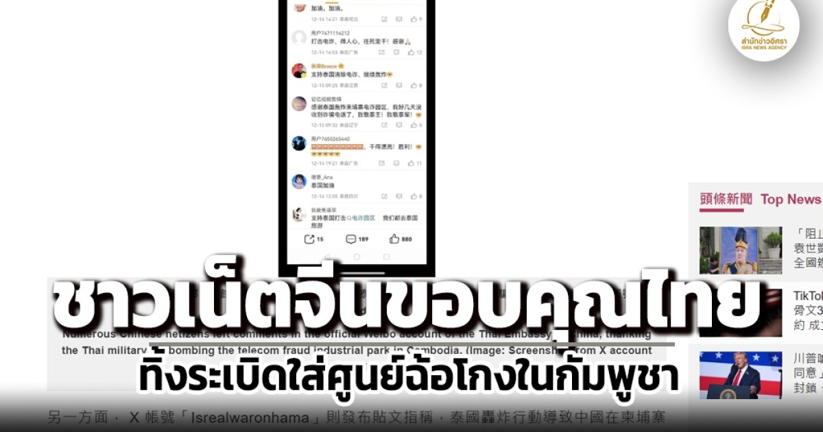 สำนักข่าวอิศรา (www.isranews.org) รายงานข่าวเกี่ยวกับสถานการณ์ความขัดแย้งไทยและกัมพูชา อ้างอิงจากสำนักข่าว Newtalk ของไต้หวัน ระบุว่ากองทัพไทยได้เปิดฉากปฏิบัติการทางทหารภายในดินแดนกัมพูชา โดยมีเป้าหมายที่กลุ่มอาคารซึ่งต้องสงสัยว่าเกี่ยวข้องกับการฉ้อโกงทางโทรคมนาคม ซึ่งดึงดูดความสนใจอย่างมากจากประชาคมระหว่างประเทศและชาวเน็ตจีน เหตุการณ์นี้เกิดขึ้นในช่วงกลางเดือนธันวาคม เมื่อกลุ่มอาคารซึ่งเป็นศูนย์กลางการฉ้อโกงทางโทรคมนาคมหลายแห่งในกัมพูชา ซึ่งต้องสงสัยว่าดำเนินการโดยกลุ่มอาชญากรชาวจีน ได้ถูกกองทัพไทยทิ้งระเบิด หลังจากนั้น ชาวเน็ตจีนจำนวนมากได้หลั่งไหลเข้าไปแสดงความขอบคุณในบัญชี Weibo อย่างเป็นทางการของสถานเอกอัครราชทูตไทยประจำสาธารณรัฐประชาชนจีน โดยมองว่าการกระทำนี้เป็นการปราบปรามอาชญากรรมและปกป้องประชาชน