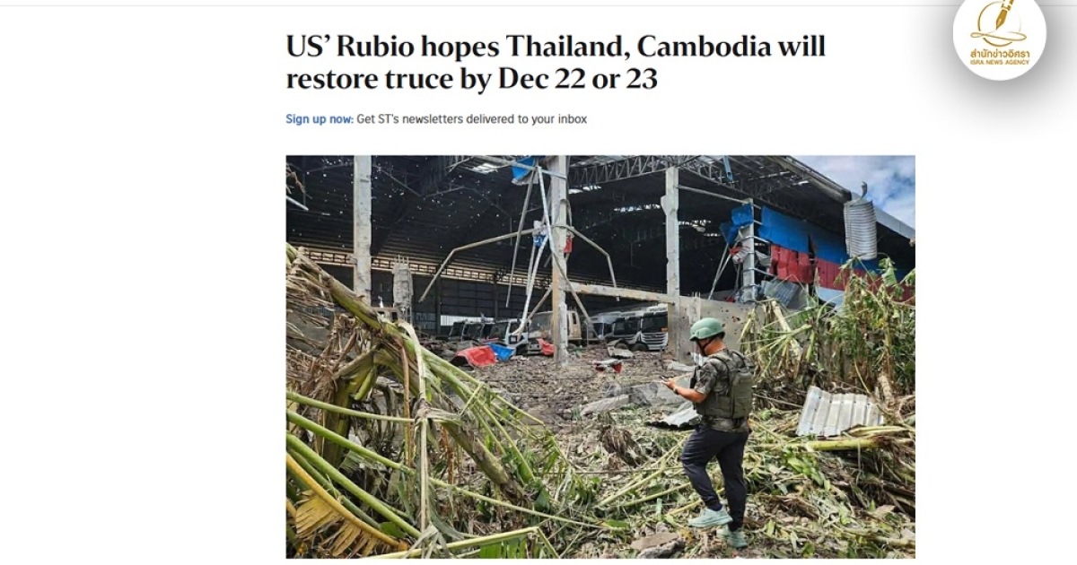 สำนักข่าวอิศรา (www.isranews.org) รายงานข่าวสถานการณ์ไทยและกัมพูชาอ้างอิงข่าวจากสำนักข่าวสเตรทไทม์สของสิงคโปร์ว่า นายมาร์โค รูบิโอ รัฐมนตรีต่างประเทศสหรัฐฯ กล่าวเมื่อวันที่ 19 ธันวาคมว่า สหรัฐอเมริกาหวังว่าจะมีการบรรลุข้อตกลงหยุดยิงอีกครั้งภายในต้นสัปดาห์หน้า เพื่อยุติการปะทะกันระหว่างกองกำลังไทยและกัมพูชา
