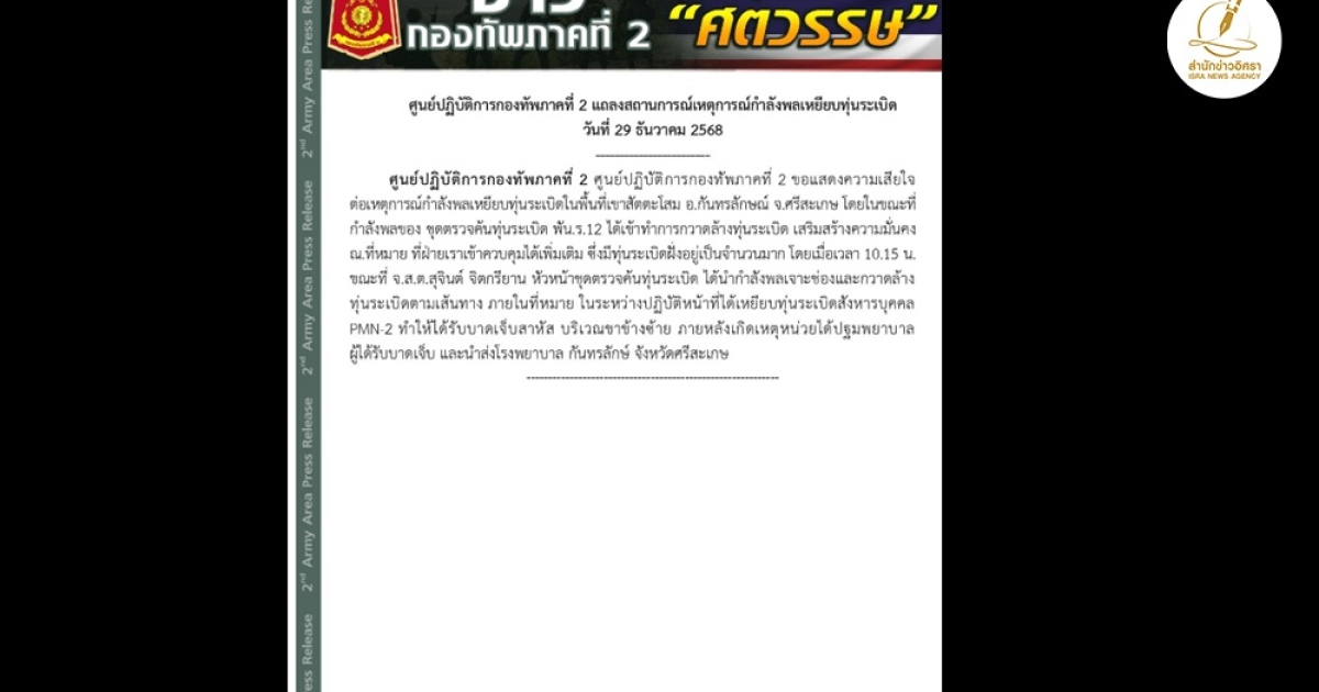 ทภ. 2 แถลง กำลังพลเหยียบทุ่นระเบิดสังหารบุคคล PMN-2 บาดเจ็บสาหัสที่ขาข้างซ้าย ขณะปฏิบัติภารกิจกวาดล้างพื้นที่เขาสัตตะโสม จ.ศรีสะเกษ เมื่อวันที่ 29 ธ.ค
