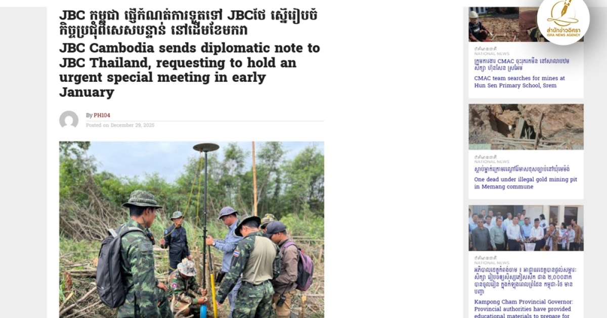 สำนักข่าวอิศรา (www.isranews.org) รายงานข่าวการเจรจาปักปันเขตแดนไทยและกัมพูชา อ้างอิงข่าวจากสำนักข่าว DAP ของกัมพูชาว่าคณะกรรมการเขตแดนร่วมบก (JBC) กัมพูชา ได้ส่งบันทึกทางการทูตถึงคณะกรรมการเขตแดนร่วมบก (JBC) ไทย เพื่อเสนอให้จัดการประชุมพิเศษครั้งต่อไปของคณะกรรมการเขตแดนร่วมบก กัมพูชา-ไทย และไทย-กัมพูชา ในสัปดาห์แรกของเดือนมกราคม พ.ศ. 2569 ที่จังหวัดเสียมราฐ เพื่อหารือและดำเนินการงานวัดและปักปันเขตแดนต่อไป